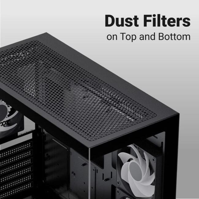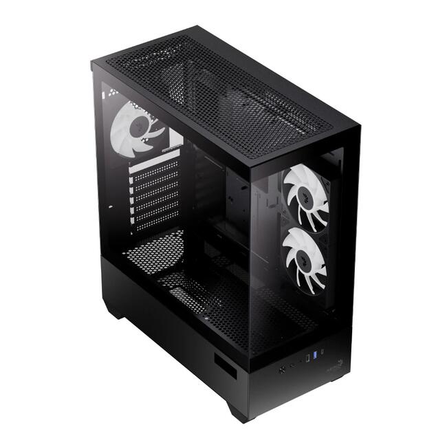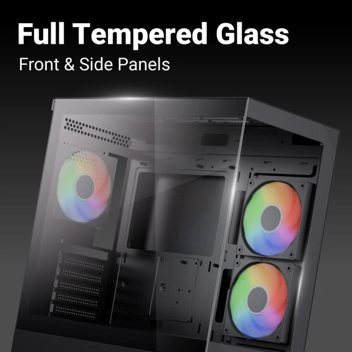 | ДОПЪЛНИТЕЛНИ | Full tempered glass front and side panels showcase your build in stunning detail Includes three 120mm ARGB fans (two reverse-blade) with Rifle Bearing Supports GPUs up to 418mm for top-tier gaming and creative performance Fits CPU air coolers up to 165mm for powerful and quiet cooling Magnetic and PVC dust filters make cleaning fast and hassle-free Snap-fit side glass panel allows easy upgrades and maintenance Comes with a real-time digital status display built into the case exterior |