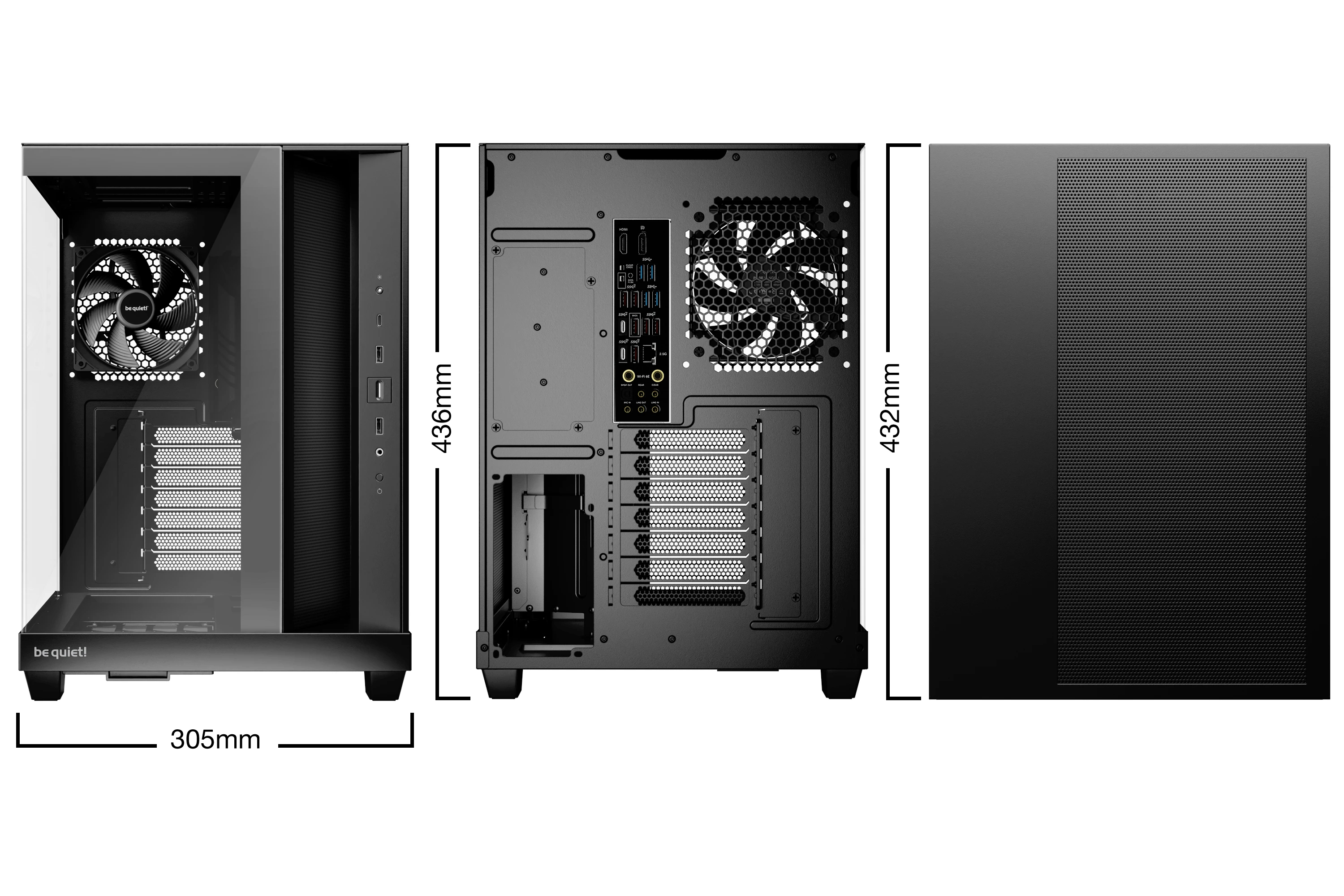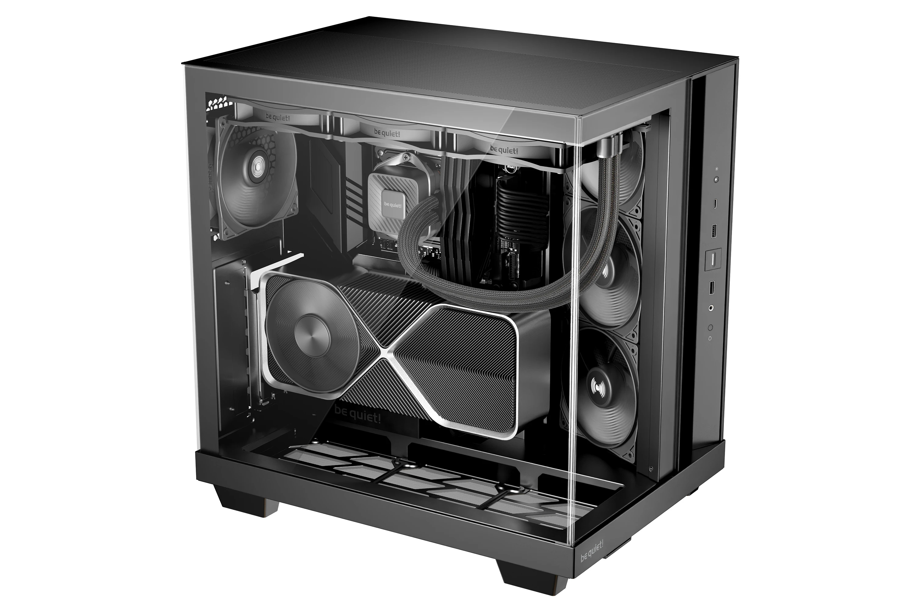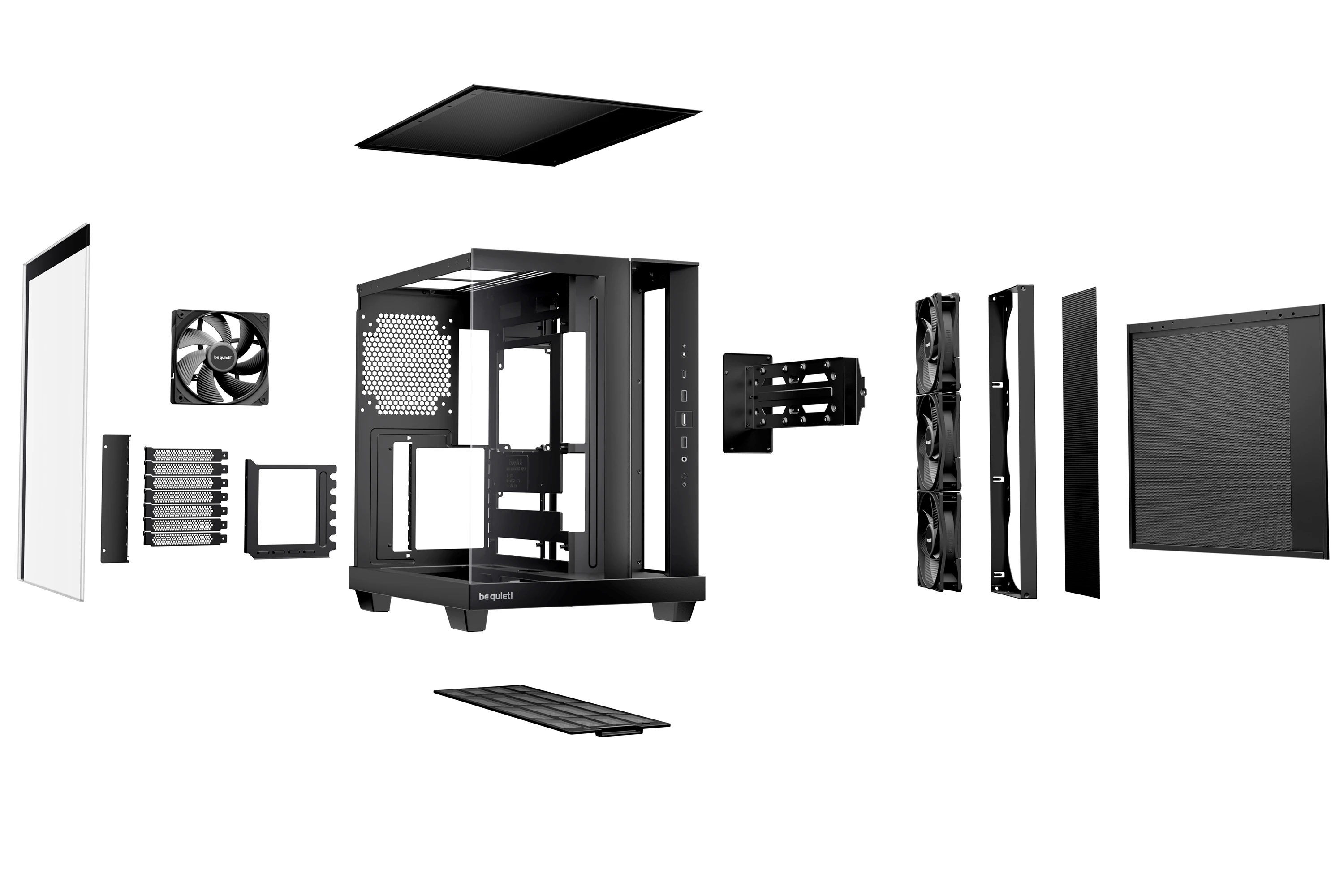 | ДОПЪЛНИТЕЛНИ | Angled slide-out fan frame on the side routes air directly to the GPU Fans can be installed in the lowered fan bay to line up perfectly with the case floor 4 preinstalled Pure Wings 3 120mm PWM f ans for extraordinary airflow Spacious design for radiators up to 360mm, an ATX motherboard, 2 HDDs and SSDs at the same time 2 possible PSU positions enable backside connector motherboards |