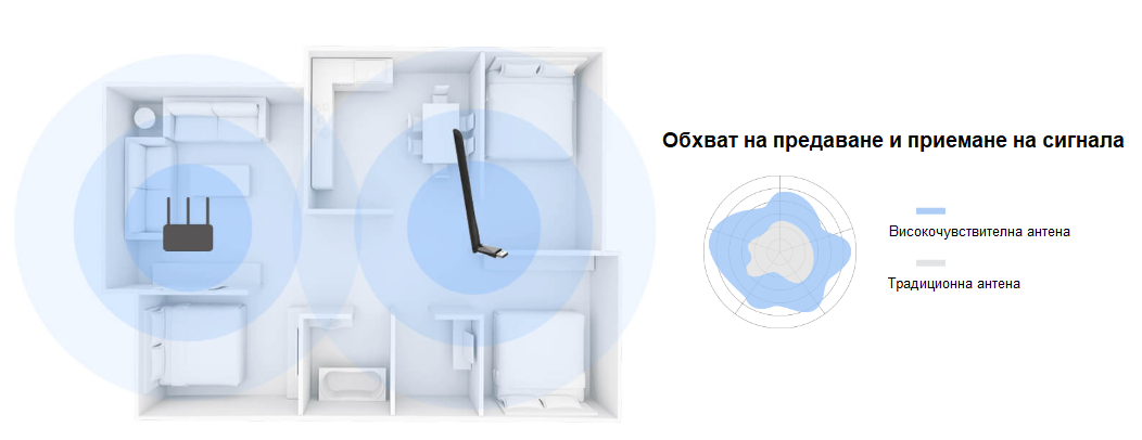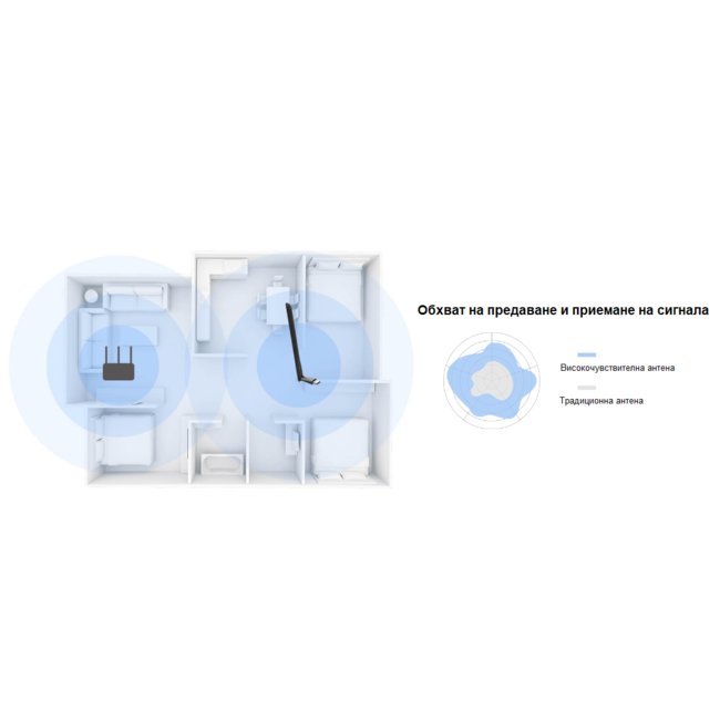 Високочувствителната антена достига вашия рутер от по-голямо разстояние с по-точен насочен обхват, осигурявайки по-бързи и по-стабилни безжични връзки.