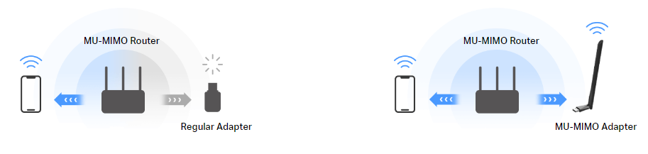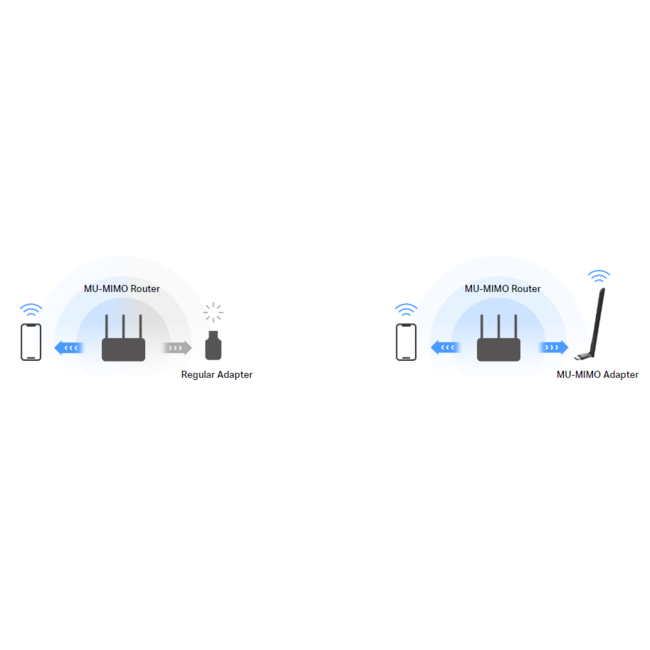 Технологията MU-MIMO осигурява два едновременни потока данни, подобрявайки капацитета и ефективността на цялата мрежа при работа със съвместим MU-MIMO рутер.