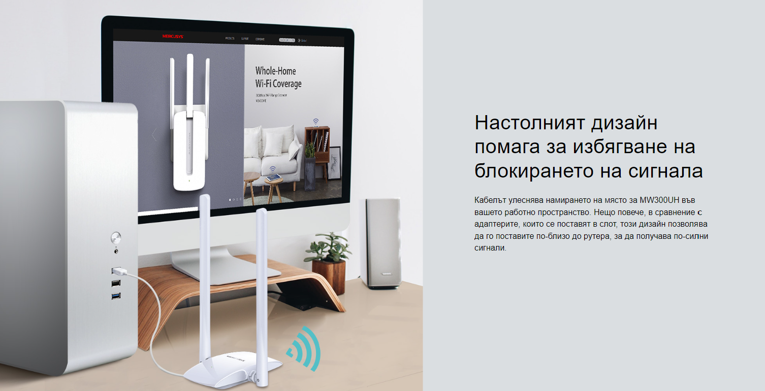 MW300UH разполага с две усилващи външни антени, за да гарантира по-силно предаване и приемане на сигнала, което помага на потребителите да получат стабилна Wi-Fi връзка в целия дом.