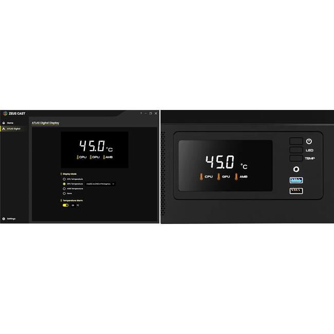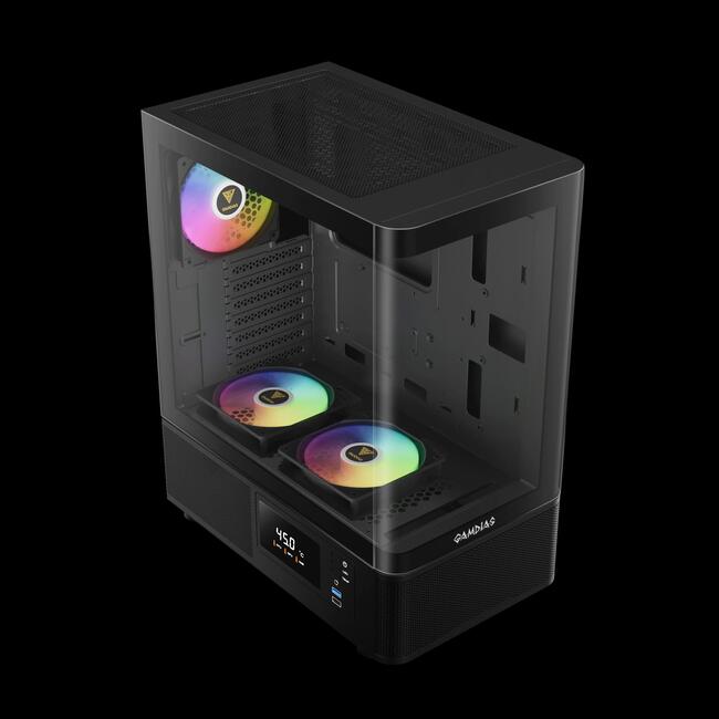 | ДОПЪЛНИТЕЛНИ | Seamless Curved Glass Display Perforated Air Vent PSU Chamber 3 Built-in 120mm ARGB Fans (2 x Reverse Intake Fans) Customized Monitor for System Information and Ambient Temperature Fits Mini-ITX, Micro-ATX, and ATX motherboards Magnetic Dust Filter Compatible with 340mm GPU |