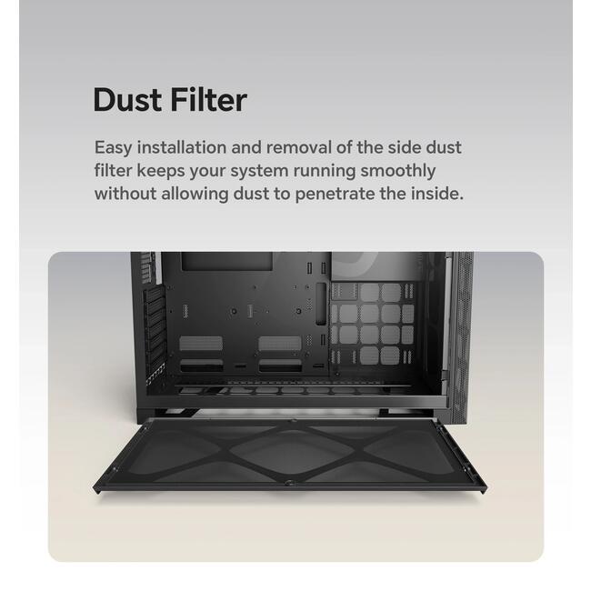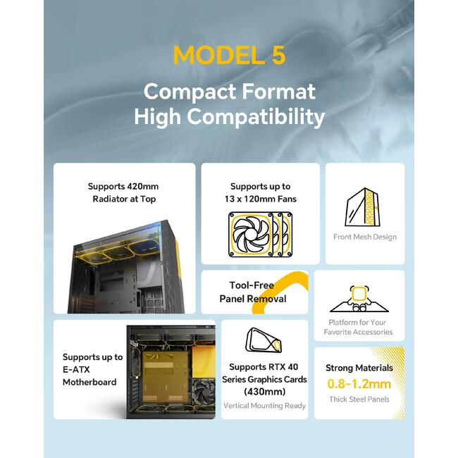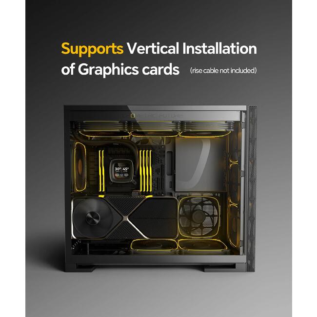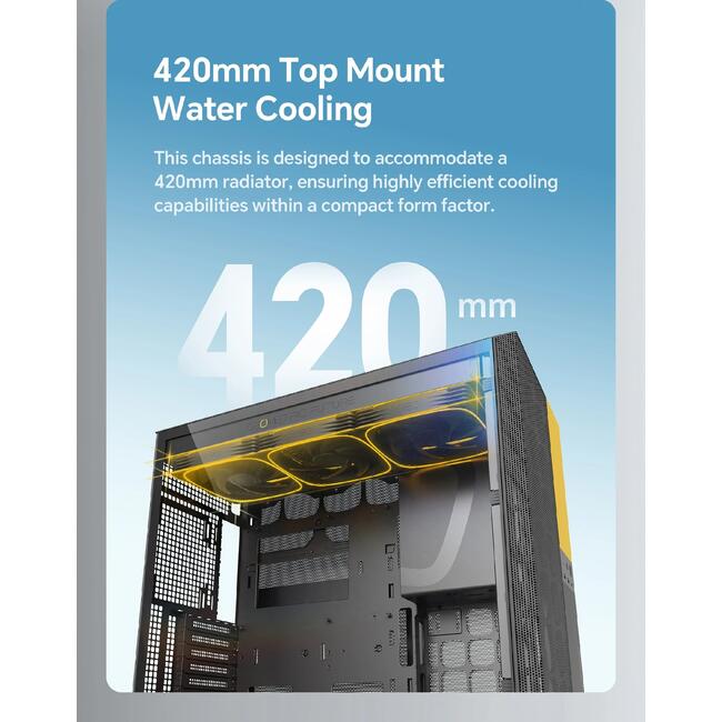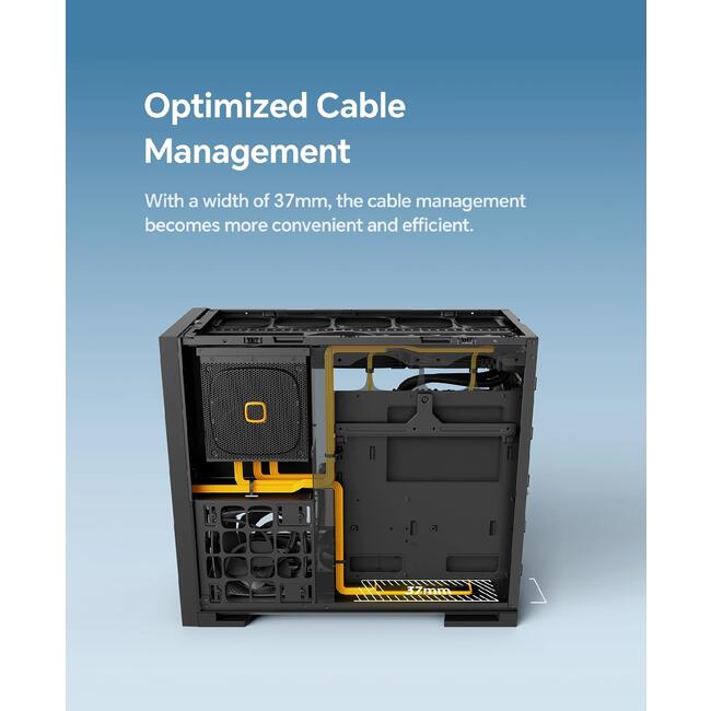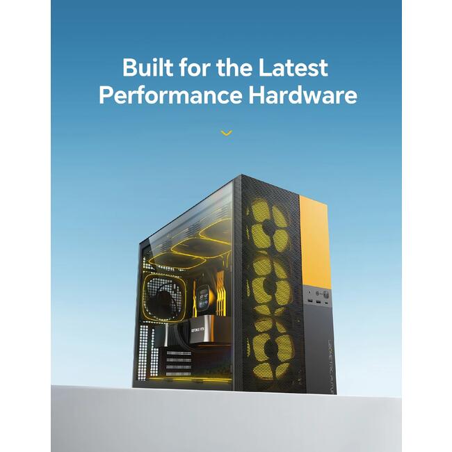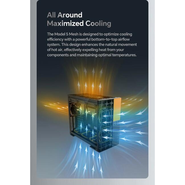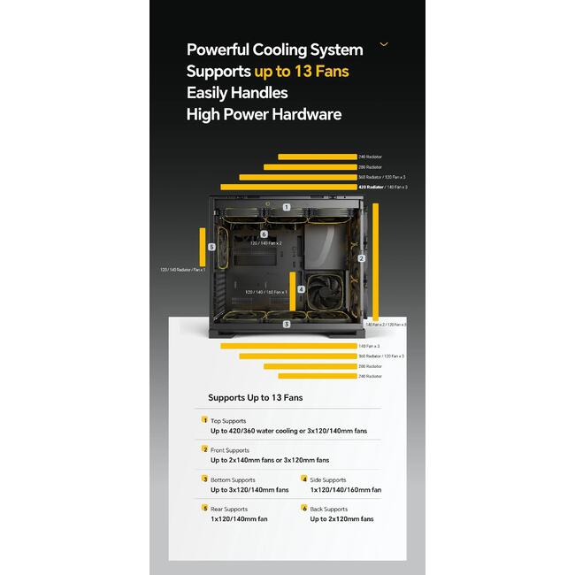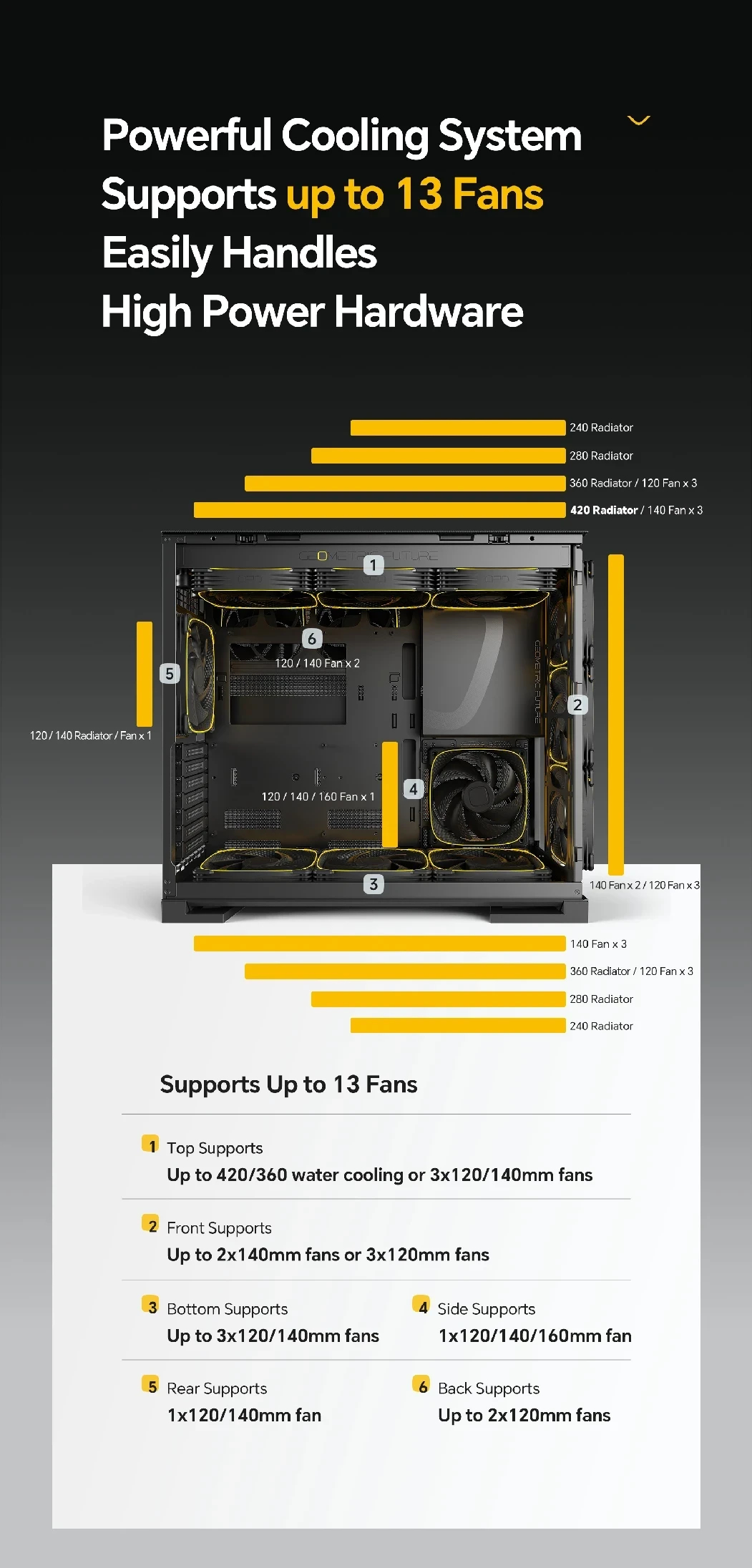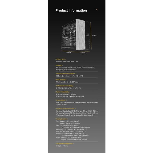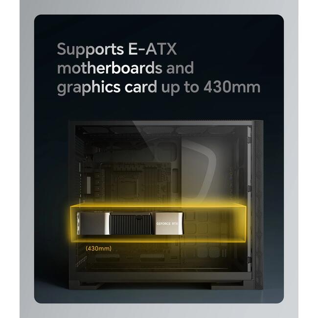 ДОПЪЛНИТЕЛНИ | 5 x 140 mm ARGB fans Pre-Installed (Bottom and Front Side reversed) Optimized mesh panel for maximum airflow performance Supports 420mm radiator, E-ATX and 430mm GPUs 0.8-1.2mm thick steel for entire chassis Supports up to 13 x 120mm fans Fun yet functional built-in display platform Unique location for the PSU |
