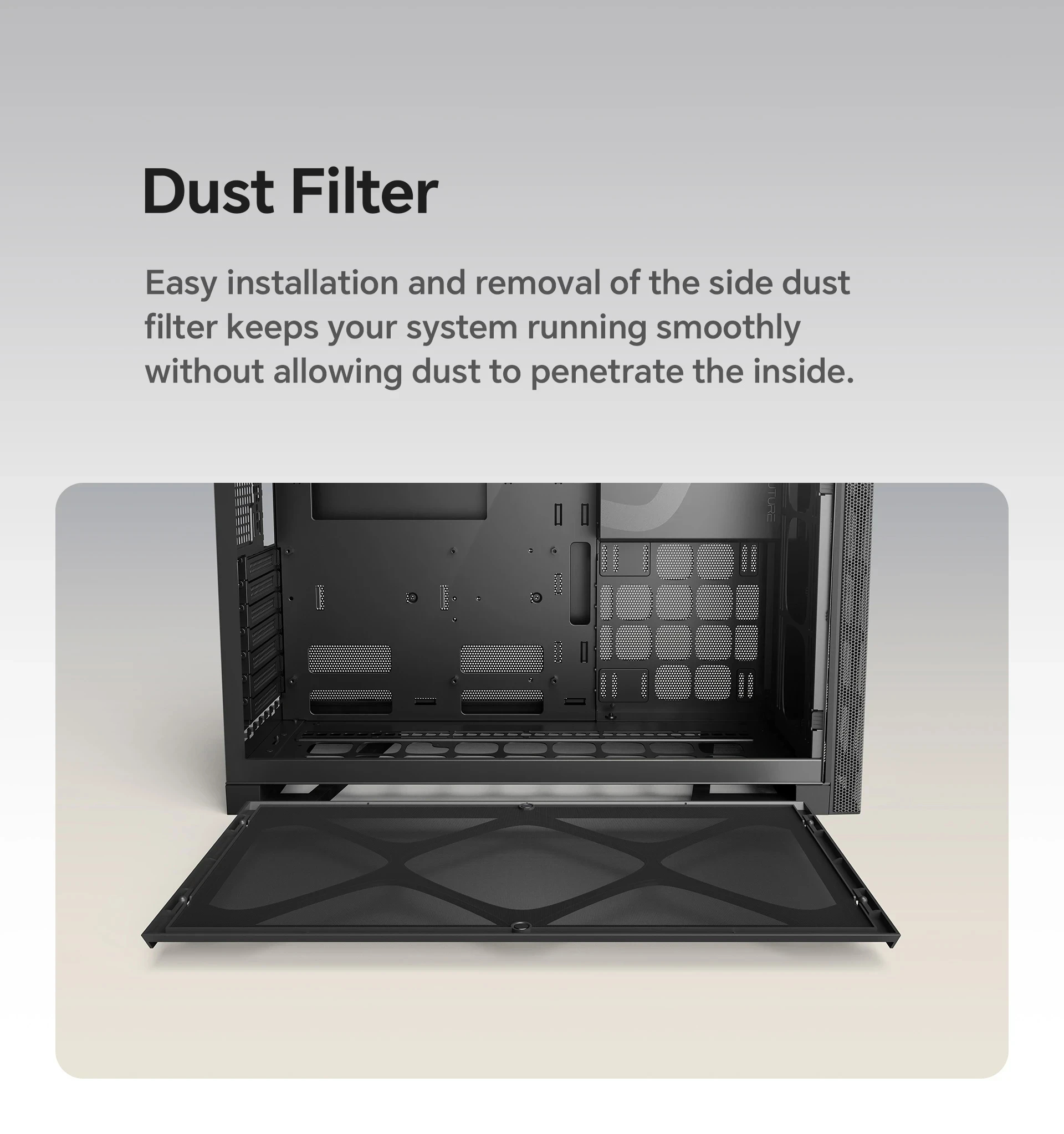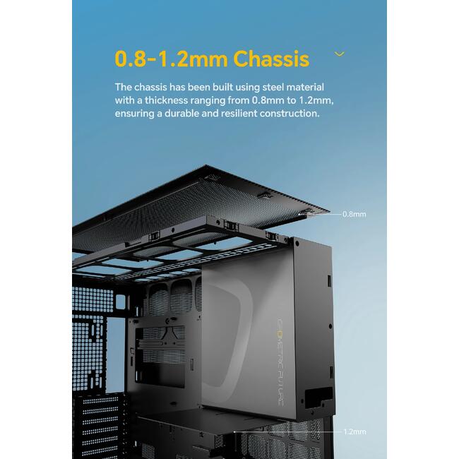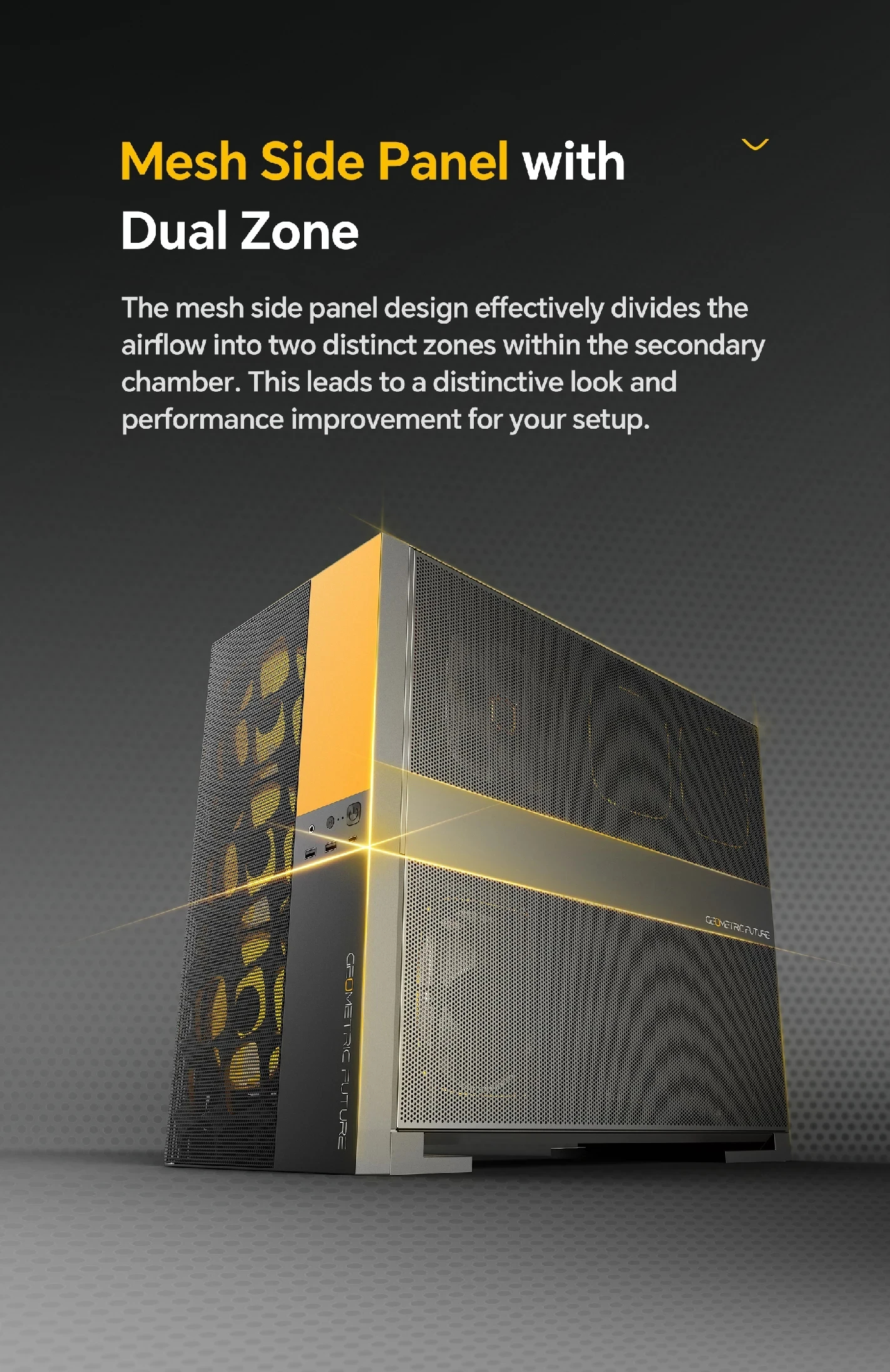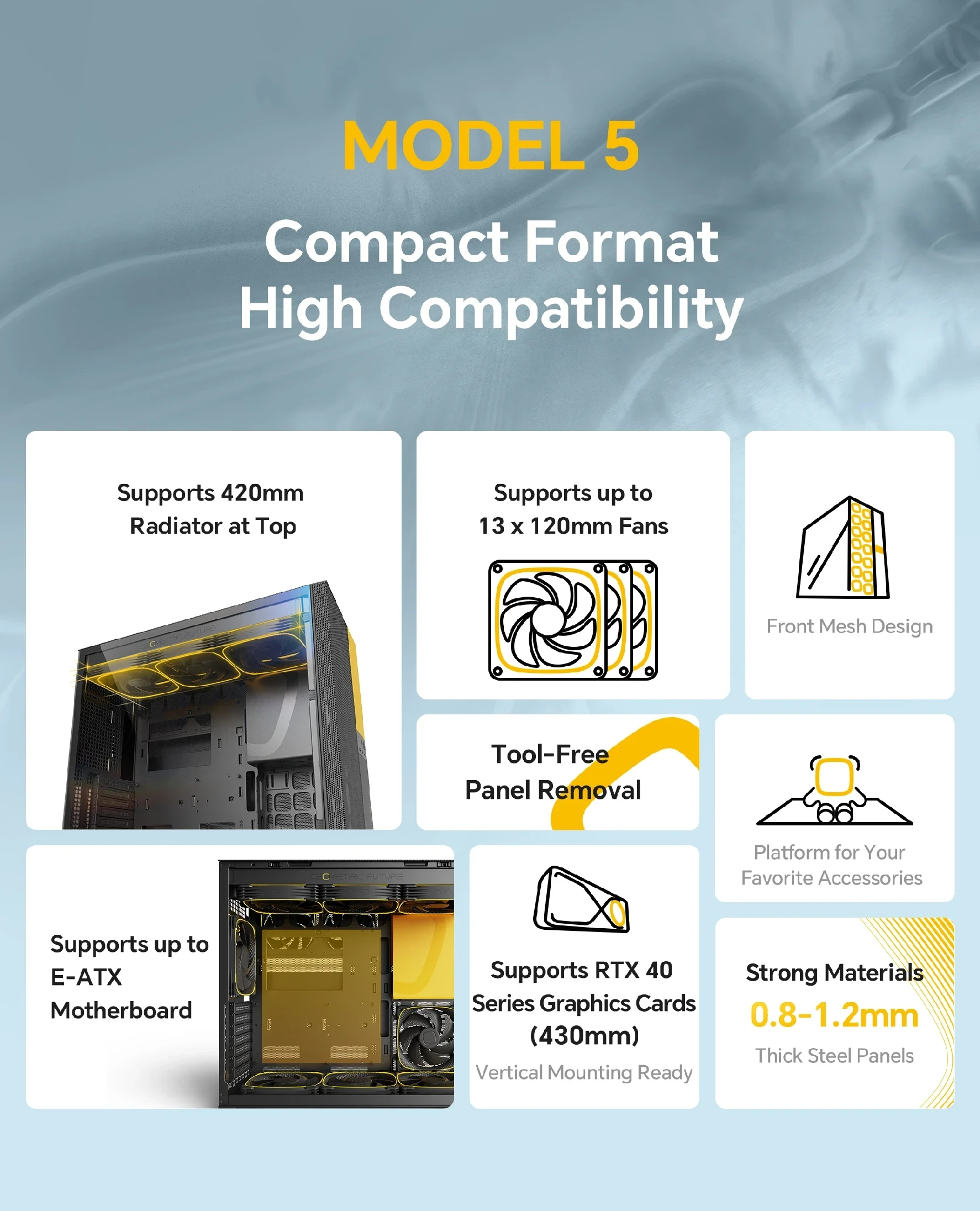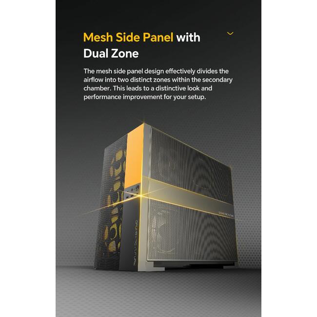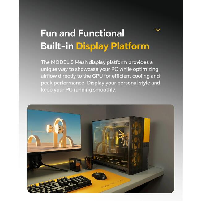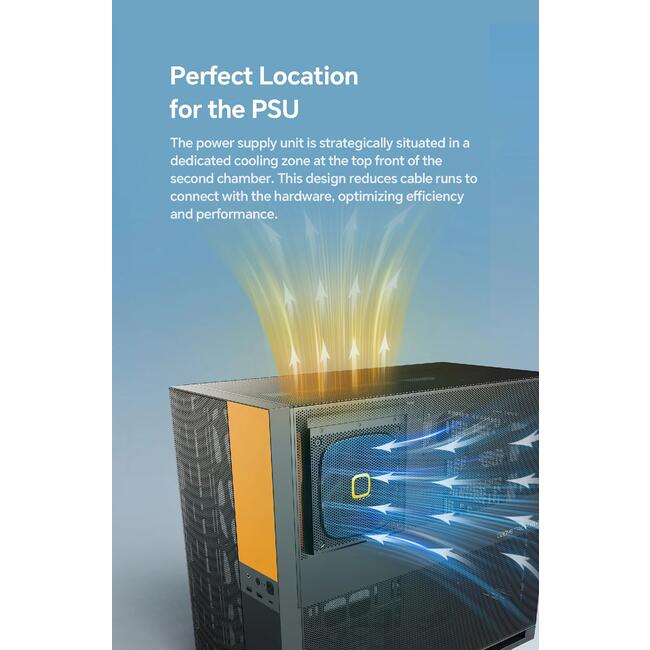 ДОПЪЛНИТЕЛНИ | 5 x 140 mm ARGB fans Pre-Installed (Bottom and Front Side reversed) Optimized mesh panel for maximum airflow performance Supports 420mm radiator, E-ATX and 430mm GPUs 0.8-1.2mm thick steel for entire chassis Supports up to 13 x 120mm fans Fun yet functional built-in display platform Unique location for the PSU |