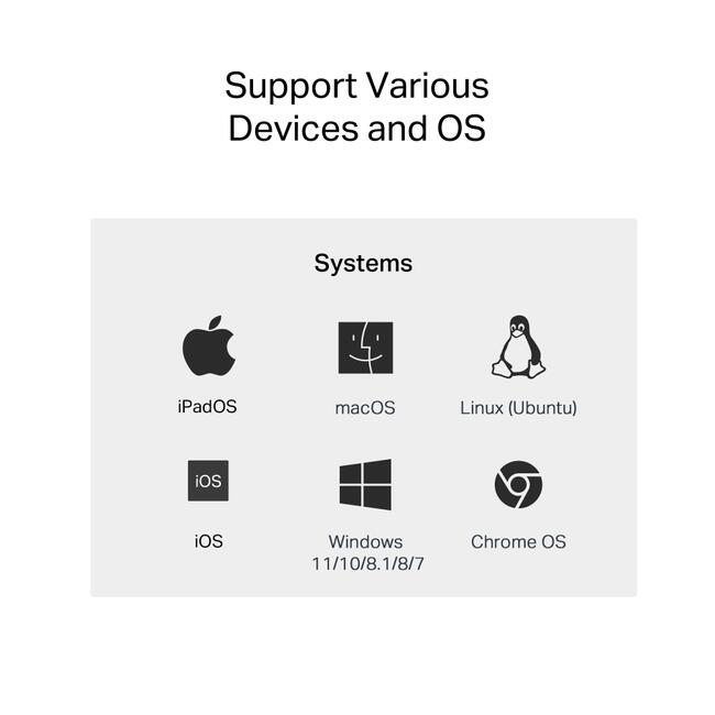 *Plug and Play за Windows 11/10/8.1/8/7, Mac OS 10.15 и по-нови версии, Chrome OS ядро 5.13 и по-нови версии, Linux OS ядро 5.13 и по-нови версии, iOS и iPad OS 13.3 и по-нови версии. Скоро ще се поддържат по-късни версии на ОС.