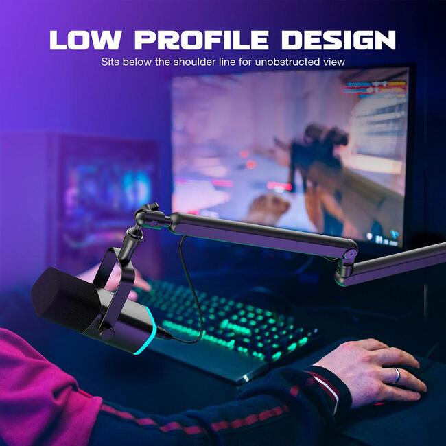 Нископрофилният дизайн позволява рамото да се разпъва под ръба на бюрото или монитора, спестявайки място и без да пречи на работната зона или видимостта – подходящо както за професионални конфигурации, така и за ежедневна употреба.