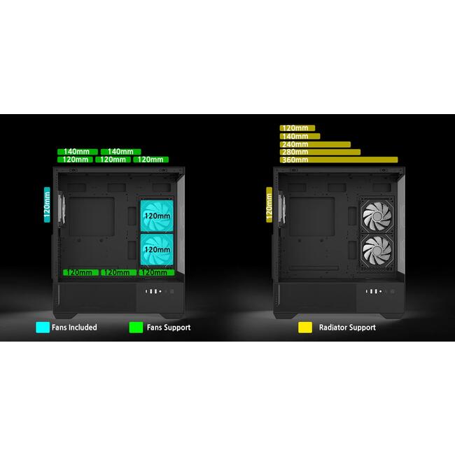 | ДОПЪЛНИТЕЛНИ | Modern & Sleek Design Panoramic View With Seamless Tempered Glass Panels Tool-Free Glass Panels Optimal Airflow Pre-installed ARGB Infinity Mirror Fans Mesh Bottom Panels 6-port PWM/ARGB hub |