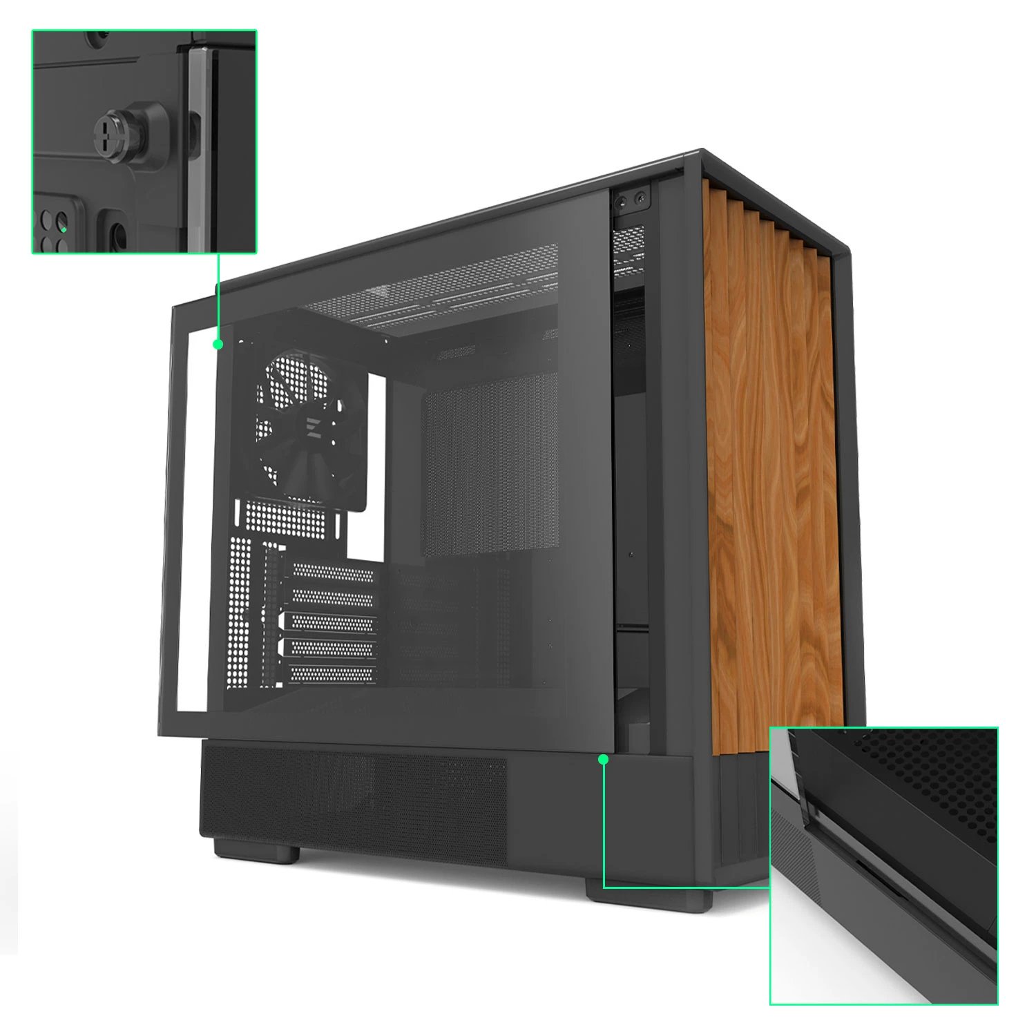 ДОПЪЛНИТЕЛНИ | Wooden elements Premium Tempered Glass Tool-Free Tempered Glass Unrestricted Cooling Potential Easy Accessible I/O Ports Top/Bottom Magnetic Dust Filter 120mm Non-LED Fans GPU Support Bracket Included With Height Adjustment |