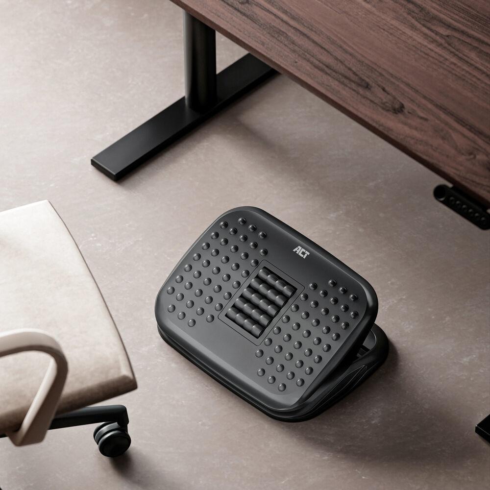 Поставката за крака AC8020 осигурява удобна ергономична позиция при работа на бюро. Регулируемата височина и наклон позволяват адаптация към вашата поза. Масажните ролки и текстурираната повърхност стимулират кръвообращението в краката, а антислип подложките осигуряват стабилност на поставката.
