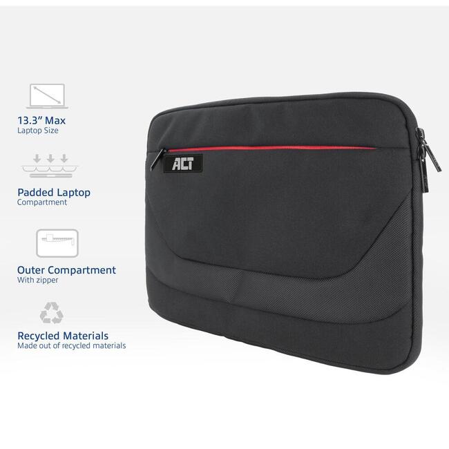 ACT Suburb калъф за 13.3" лаптоп (AC8575) е тънък и лек rPET калъф от рециклирани пластмасови бутилки, създаден за ежедневна защита и удобно пренасяне. Водоустойчивата външна материя и меката вътрешна подплата предпазват устройството от надраскване и леки удари, а външният джоб с цип побира зарядно, мишка и кабели. Подходящ е както за самостоятелно носене, така и за поставяне в раница или чанта.