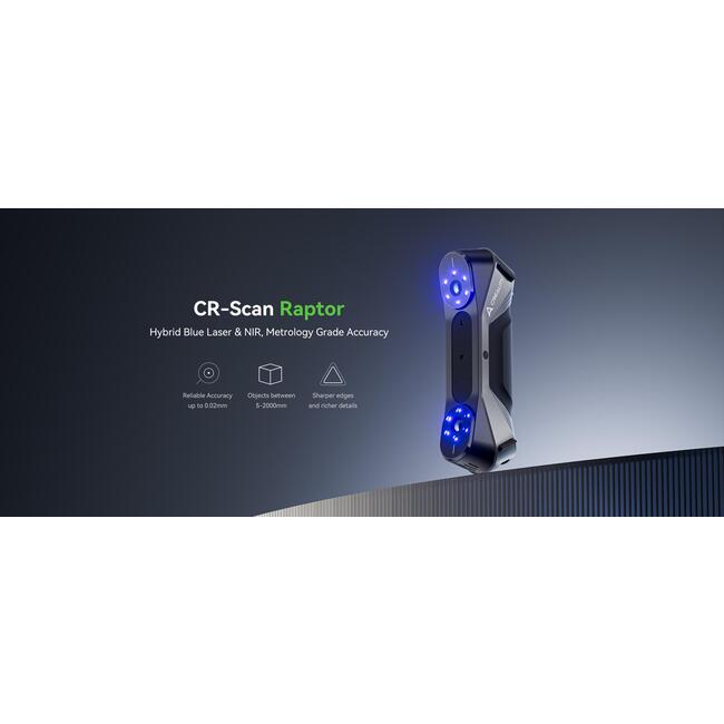 Creality CR-Scan Raptor е високопрецизен портативен 3D скенер, разработен за детайлно сканиране на малки, средни и по-големи обекти. Моделът комбинира син лазер и NIR инфрачервена структурирана светлина, което позволява гъвкава работа според типа обект и необходимата точност. Производителят посочва точност до 0.02 mm, което прави устройството подходящо за инженерни приложения, реверсивно проектиране, дигитализация на детайли и подготовка за 3D печат.