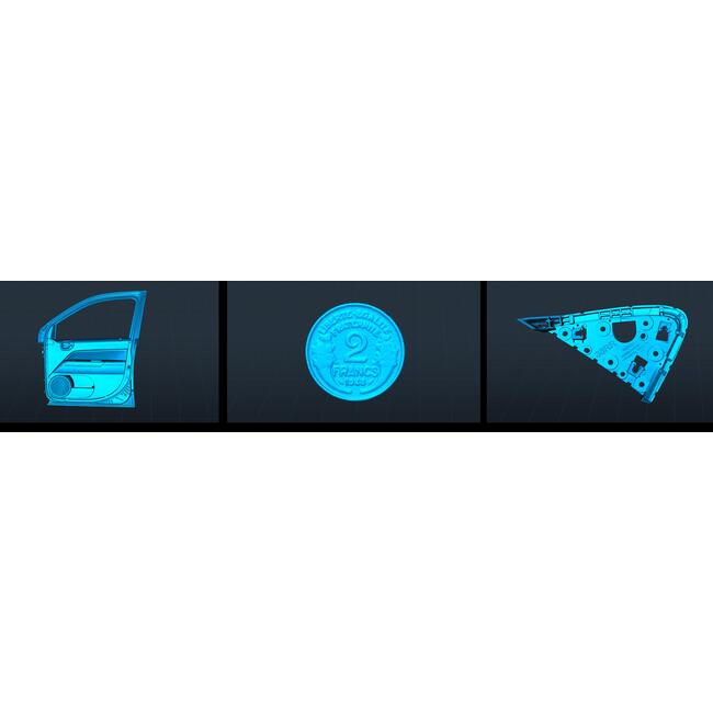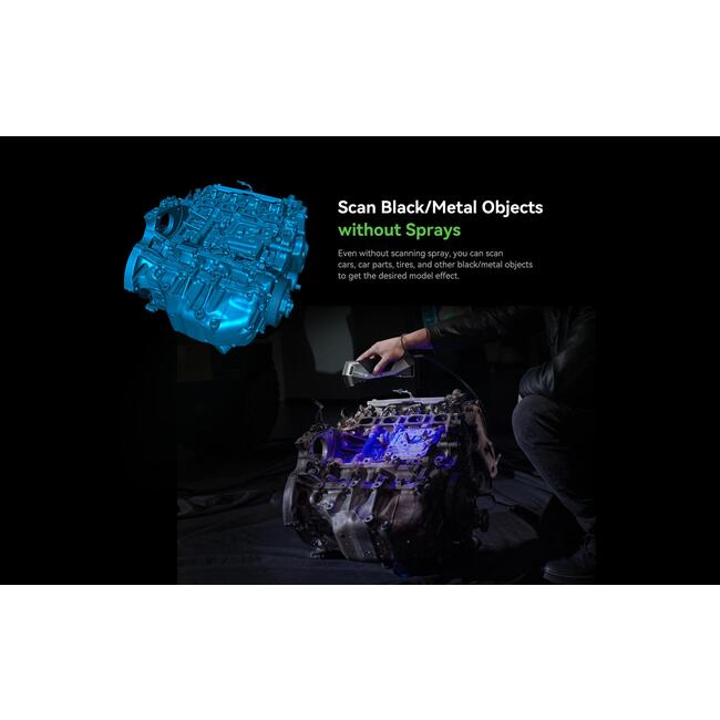 Скенерът покрива широк диапазон на обектите за сканиране – от 5 x 5 x 5 mm до 2000 x 2000 x 2000 mm, което го прави универсално решение както за миниатюрни детайли, така и за значително по-големи елементи. Работното разстояние е 150 – 400 mm в син лазерен режим и 170 – 1200 mm в NIR режим.