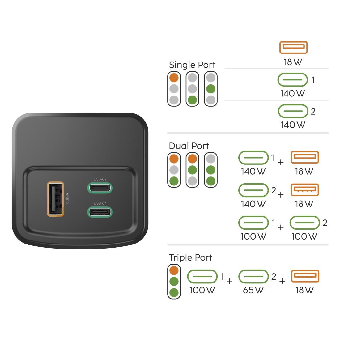 Изходи: 2× USB-C, 1× USB-A