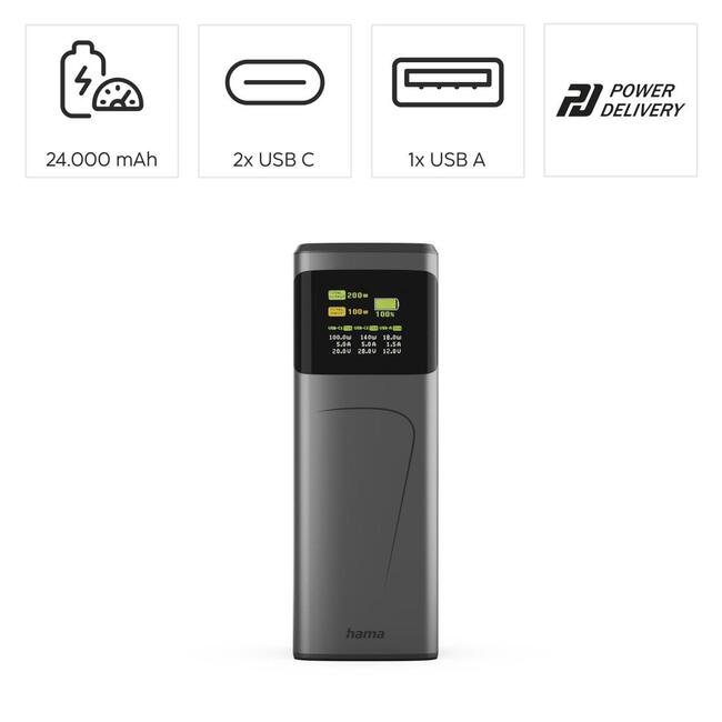 Мощната външна батерия на Hama с капацитет 24 000 mAh осигурява ултра бързо зареждане, подходящо дори за лаптопи. Благодарение на максимална мощност от 200W и технологията Power Delivery 3.0 / QC 3.0, устройството зарежда смартфони, таблети, слушалки, камери и дори по-взискателни устройства като ноутбуци – бързо и безопасно. В комплекта е включен висококачествен USB-C кабел 240 W, което позволява и самата батерия да бъде зареждана изключително бързо – само за около 2.1 часа.