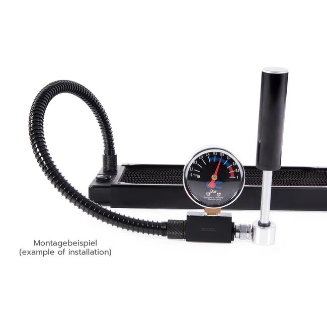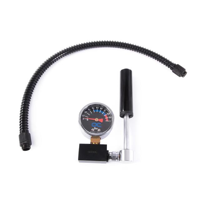 Свързвате инструмента за тестване на утечки Alphacool към свободен G1/4" порт в системата и работите с ръчната помпа, докато се достигне желаното налягане. Моля, имайте предвид, че може да има различни максимални спецификации в зависимост от производителя на хардуера. Сега трябва да изчакате около 15 до 20 мин. Ако налягането не спадне след това време, вашият охлаждащ контур е херметичен и следователно водонепропусклив.