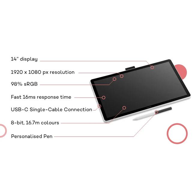 Wacom One 14 е иновативен графичен дисплей таблет с просторен 14-инчов Full HD IPS екран, който осигурява естествено и точно изживяване при рисуване директно върху дисплея. Съчетавайки лекото тегло от само 750 грама и компактен дизайн, таблетът е лесен за работа както у дома, така и в движение.