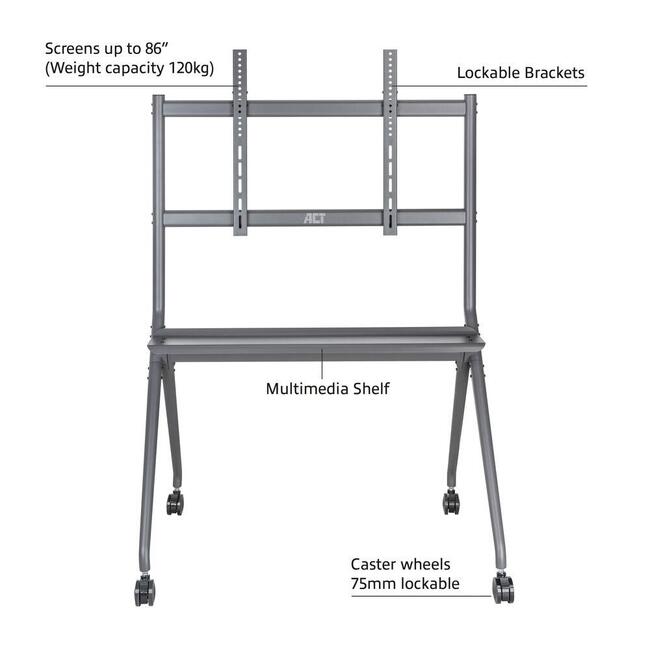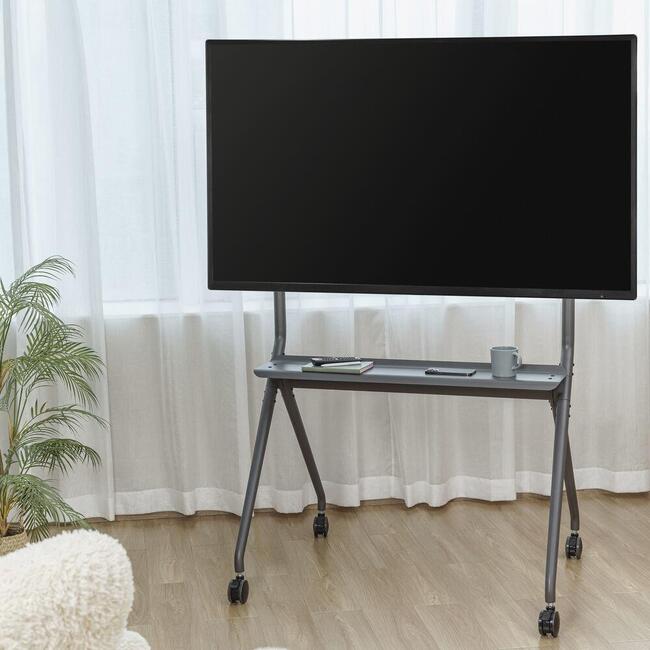 Масивната стоманена стойка е проектирана за безопасно и лесно преместване на екрани с големи диагонали от 50 до 86 инча. Със своята изключителна товароносимост до 120 кг, тя е идеалното решение за професионална употреба в корпоративни зали, образователни центрове и изложбени пространства, където стабилността и мобилността са от критично значение.