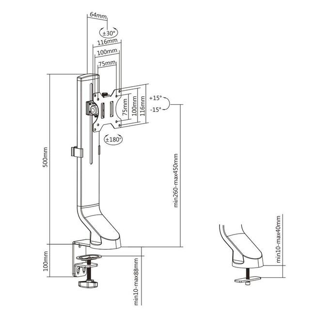 ACT AC8321 е ергономична стойка за един монитор до 32" и 8 kg, с лесно регулиране на височината чрез удобен винт (thumb screw), стабилен монтаж към бюро и пълна свобода за позициониране на екрана, така че работното място да е по-комфортно, подредено и ефективно.