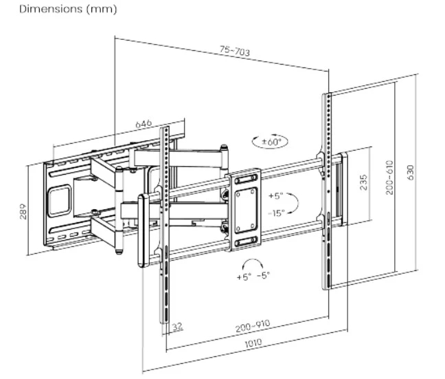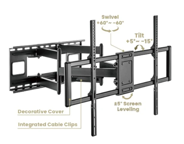 | ДОПЪЛНИТЕЛНИ | Double-arm full-motion TV wall mount Supports most 60" - 120" LCD TV’s Allows up to 120 degrees swivel and 20 degrees tilting Distance to wall: 75 ~ 703 mm Practical integrated bubble level for perfect alignment Includes all necessary installation materials |