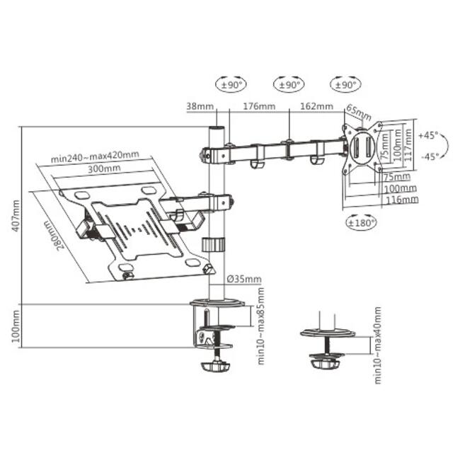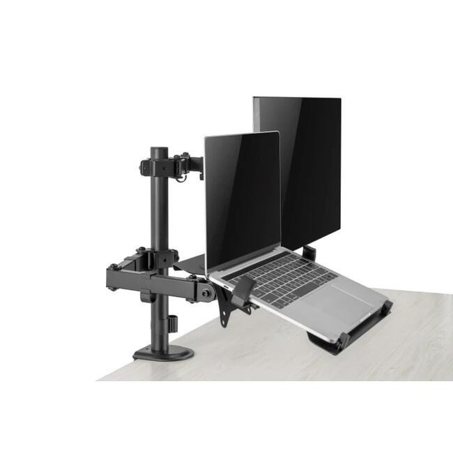 | ДОПЪЛНИТЕЛНИ | Desk mount with monitor arm and notebook stand Supports monitors up to 32" and notebooks up to 15.6" Arm rotates (+180° ... -180°), tilts (+/-45°) to change reading angles, and allows to rotate display from landscape-to-portrait mode, etc Works with almost any LCD monitor (max. 32") Adjustable metal tray with ventilation holes for a notebook Strong desk clamp or grommet for easy and secure fixation on your desk Built-in cable management for an organized and neat workspace |