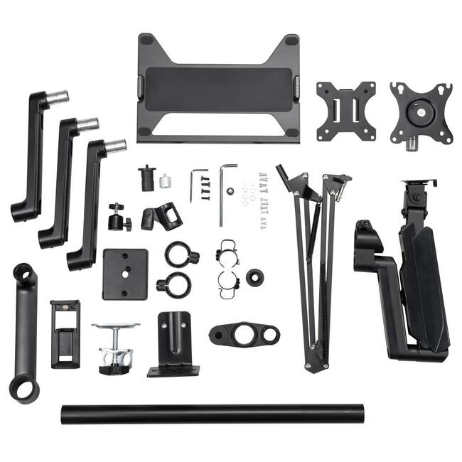 Индивидуално използваем статив за стрийминг с 4 регулируеми на височина рамена и включени различни аксесоари - идеален за стрийминг настройка, като студио за стрийминг на живо и за игри, за влогъри и стрийминг сесии в Twitch, YouTube и др., като ергономична работна станция в офиса или домашен офис и др.