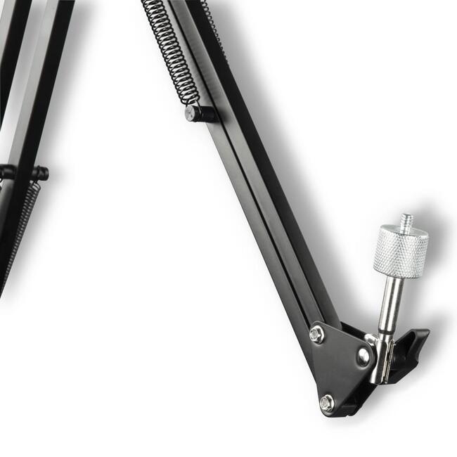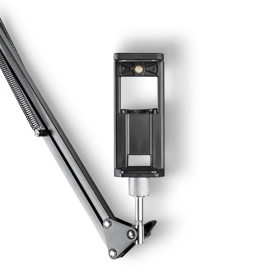 Рамото на микрофона с алтернативна опция за закрепване на държач за таблет или смартфон с помощта на адаптера с резба 1/4" в комплекта