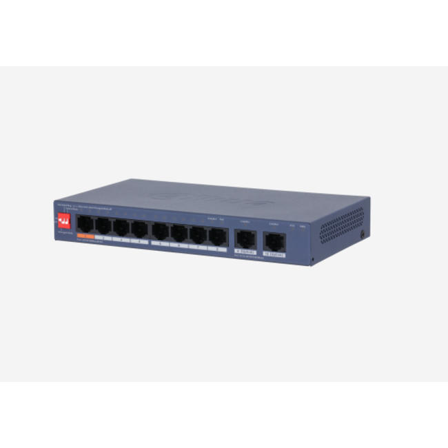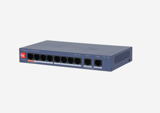 10-портов Layer 2 POE суич оптимизиран за системи за видеонаблюдение. 8x RJ45 порта 10/100Base-TX POE, 2x RJ45 gigabit uplink порт 100/1000Base-T. Протоколи: IEEE802.3, IEEE802.3u, IEEE802.3X, IEEE802.3af, IEEE802.3at, Hi-POE, MDI/MDIX self-adaptation. Максимална мощност на порт 1: 60W, порт 2-8: 30W. Обща мощност 96W. Комутираща способност: 5.6Gbps, буферна памет 4Mb, Mac table: 8K, Packet forward: 4.17Mpps. DIP за on/off на Cloud-Managed, PoE Watchdog, PoE на голямо разстояние. Вградена гръмозащита 6KV. Работна температура: -10C?~55?C. Метален корпус с размери: 190х100х26mm. Режим Extend Mode: 10Mbps POE на разстояние до 250m с изолация на портове 1~8. Комплект със захранващ адаптер.