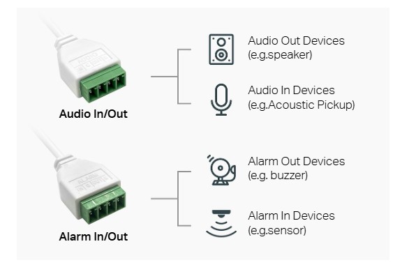 Аудио вход/изход и алармен вход/изход позволяват лесна интеграция с външни алармени или системи за контрол на достъпа.