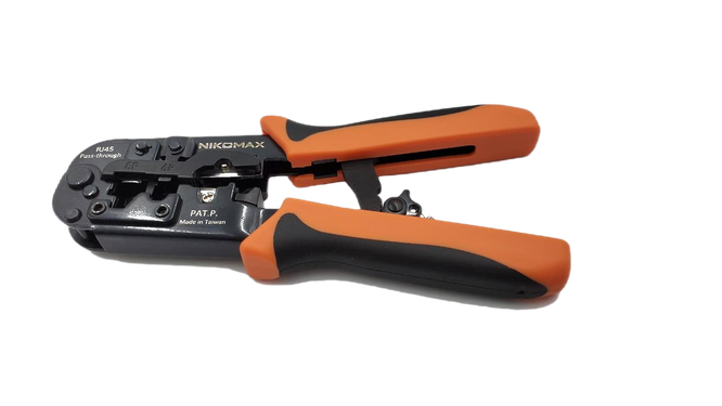 NIKOMAX Инструмент за кримпване на конектори RJ45 позволяващи преминаването на кабелни жила. Едновременно кримпва и изрязва стърчащите краища на жилата. Поддържани конектори - RJ45/8P8C, RJ12/6P6C, RJ11/6P4C, 4P4C, 4P2C. Заголва кръгли и плоски кабели. Ратчет механизъм за обратния ход на дръжката. Работна температура -10º~50ºC. Гаранция 2 години.