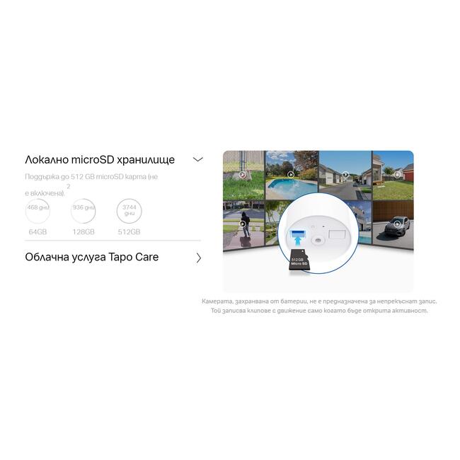 | Захранване | Built-in Rechargeable Lithium-ion Battery Optional Solar Panel: Tapo A201 (Sold separately) |