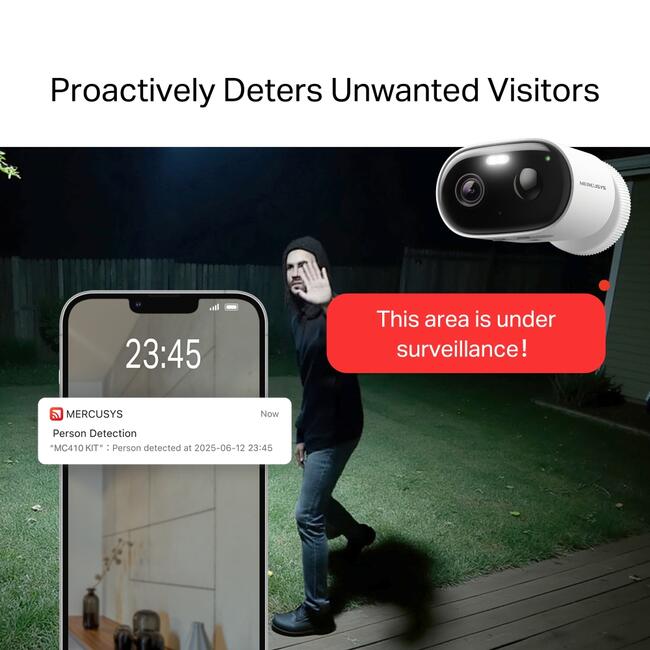 Разпознаването, задвижвано от изкуствен интелект, идентифицира хора с прецизност, а вградената светлина и сирена реагират незабавно, за да отблъснат нежелани посетители.
