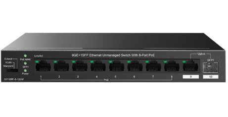 10 портов Layer 2 PoE суич оптимизиран за видеонаблюдение. 8*10/100/1000Mbps Auto MDI/MDIX RJ45 port + 1*10/100/1000Mbps + 1*100/1000Base-X SFP ports; 6kV защита на портовете. Протоколи: IEEE 802.3, IEEE 802.3u, IEEE 802.3ab, IEEE 802.3x, IEEE 802.3af, IEEE 802.3at. Пропусквателна способност: 20Gbps, Mac table: 8K, Forward speed: 14.9Mpps. максимална PoE мощност 110W. VLAN mode – портове 1-6 изолирани, но всеки порт може да комуникира с SFP 1. Работна температура 0Cº~45ºC. Размери: 178mm×104mm×26mm. Входящ волтаж 100~240V AC,50/60Hz