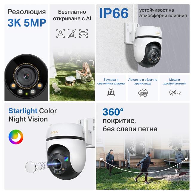 С IP66 устойчивост на атмосферни влияния, Tapo C530WS предлага отлична водоустойчивост и прахоустойчивост при използване на открито. Работи добре при дъжд, прах и топлина.