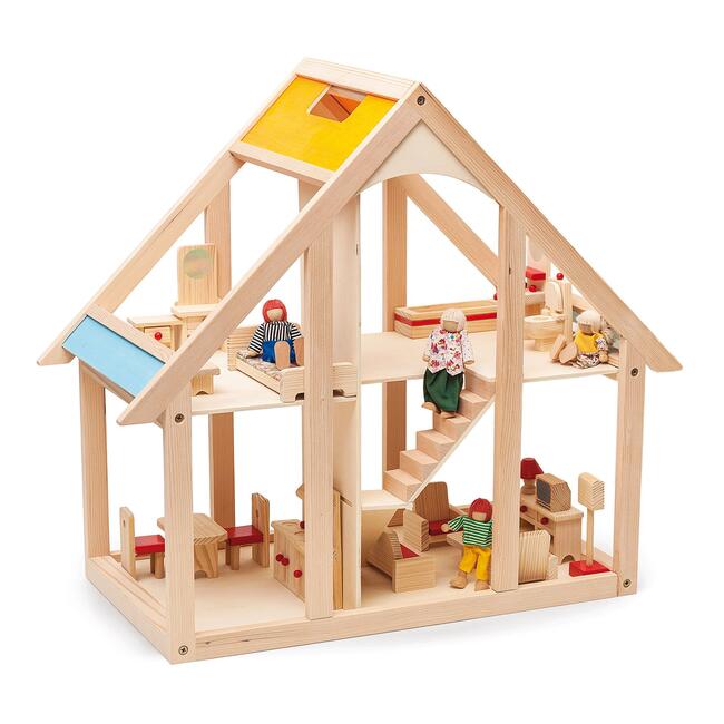 Дървена къща за кукли, изградена от стълбове. Разполага с четири стаи, оборудвани с дървени мебели и стълбище. nРазполага с дръжка в горната част за удобен пренос.nРазмери: 65 х 31 х 59 cm.n20 броя мебели, 4 фигурки на човечета с дрехи.n