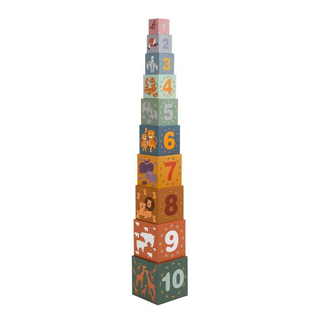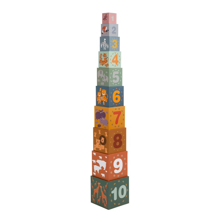 Кула за надграждане с отпечатани мотиви от животинското царство и числата от 1 до 10. Броят на изобразените животни съответства на числото, илюстрирано на обратната страна на всяко кубче.nТази игра дава начални познания на малчуганите за животните, числата, цветовете и различните размери, осигурявайки дълготрайно забавление.nКубчетата могат да бъдат поставени едно в друго с цел пестене на място при съхранение.nС дизайн, включващ висококачествени щампи в модерни цветове.n Продуктът е идеално допълнение към останалите игри от серията "Сафари".n Размери:n        – 14 x 14 x 14 cm (за най-големия куб);n        – 5 x 5 x 5 cm (за най-малкия куб).