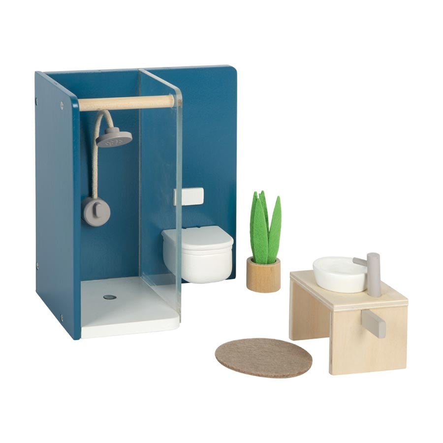 nnКомплект мебели за баня: В този комплект ще намерите всичко необходимо за една напълно обзаведена баня за кукли – мивка с огледало, тоалетна, душ и шкаф за съхранение на аксесоари. Всеки елемент е прецизно изработен от дърво, което гарантира здравина и дълготрайност.nДървени детски играчки: Комплектът е изработен от дървени играчки за бебета, които са безопасни и приятни за малките ръчички. Дървото е гладко обработено, без остри ръбове, което осигурява безопасност при игра.nПоддържане на ред и организация: Мебелите за баня учат децата на основни принципи за ред и организация. Те могат да разиграват сцени на почистване и грижа за хигиената, което е не само забавно, но и образователно.nСтимулира въображението: Тези дървени образователни играчки предоставят на децата възможността да създават своите собствени истории и да играят роли като домашни помощници, които се грижат за чистотата и реда в дома. Играчката също така насърчава социализацията, като позволява на децата да играят заедно и да си разпределят ролите в игрите.nМодерен и стилен дизайн: Мебелите имат елегантен и модерен дизайн, който ще пасне на всяка къща за кукли. Цветовете и формите са внимателно подбрани, за да създадат усещане за уют и реалистичност, което ще привлекателно за децата.nnТози комплект мебели е отличен пример за дървени играчки монтесори, които не само че предлагат забавление, но също така насърчават децата да учат чрез игра. Възможността да декорират и организират къщата за кукли им помага да развият своите креативни и практични умения.