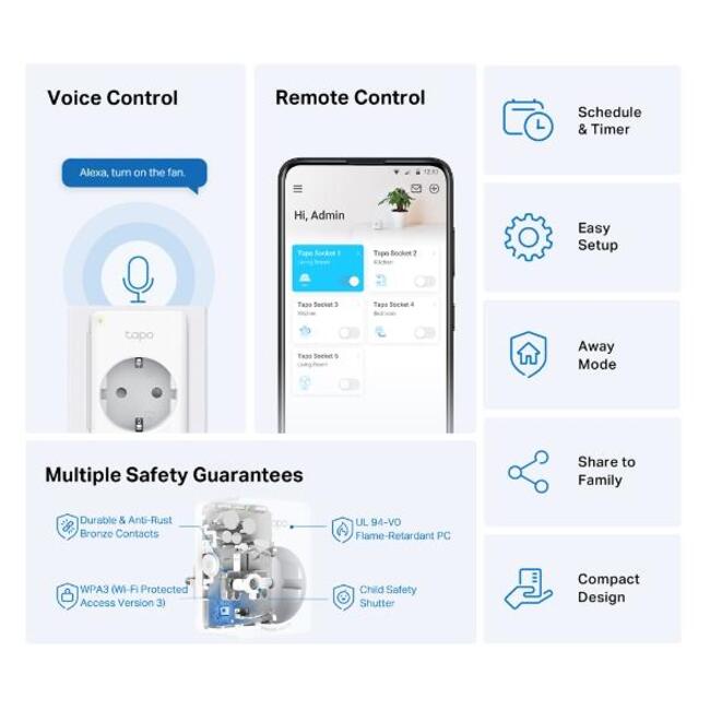TP-Link Tapo P100 е компактен смарт контакт с Wi-Fi управление, който позволява лесно и сигурно контролиране на електроуреди от всяка точка чрез мобилно приложение, графици и гласови команди.